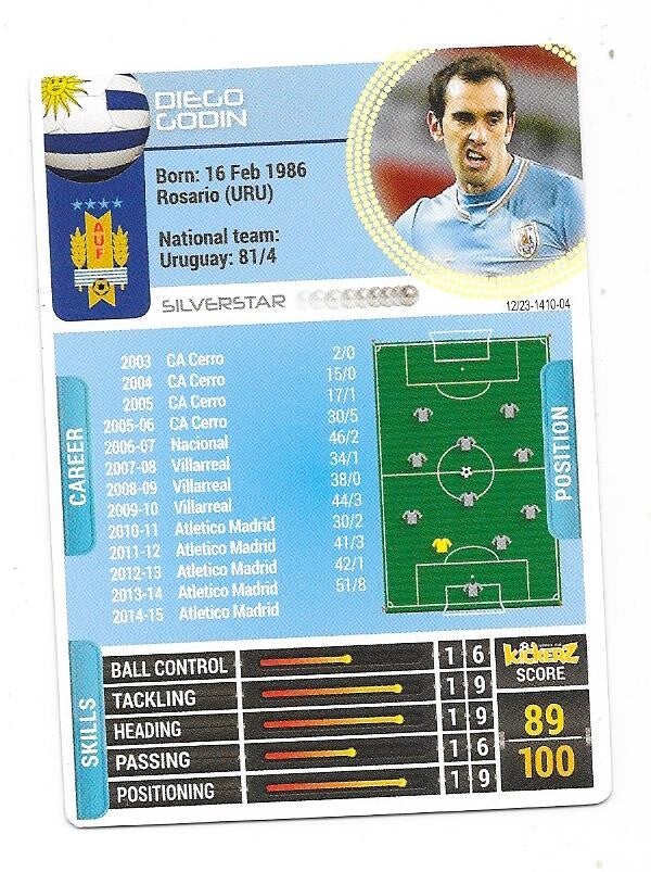 2014-15 Swedish Kickerz Goldstar # Diego Godin Atletico Madrid , Uruguay