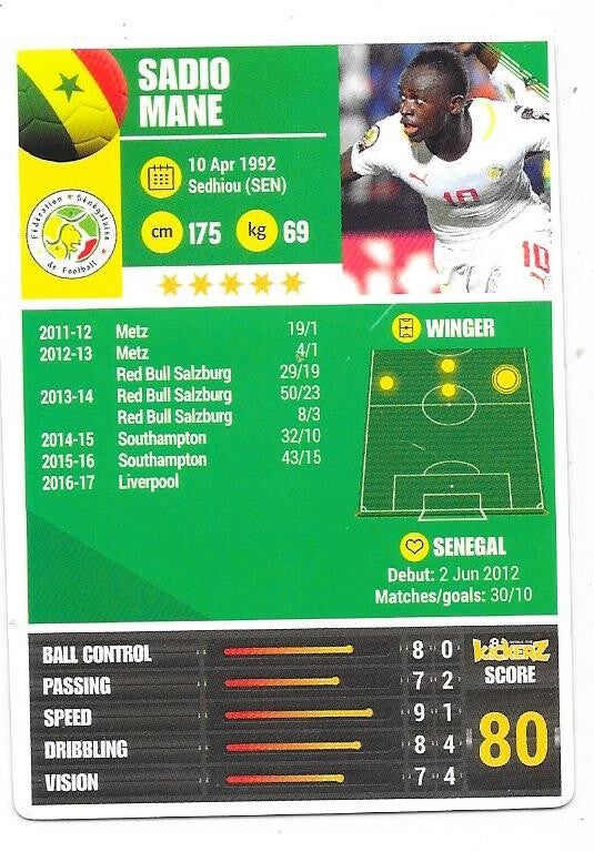 2016-17 Swedish Kickerz Goldstar #39 Sadio Mane Liverpool , Senegal