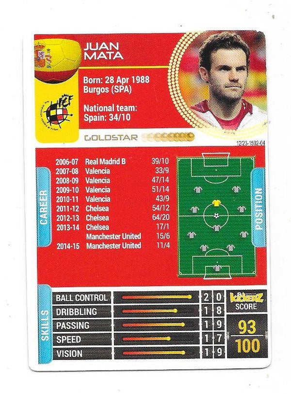 2014-15 Swedish Kickerz Goldstar # Juan Mata Manchester United , Spain , Valencia , Chelsea , Galatasaray , Vissel Kobe , Melbourne Victory , nr-nmt
