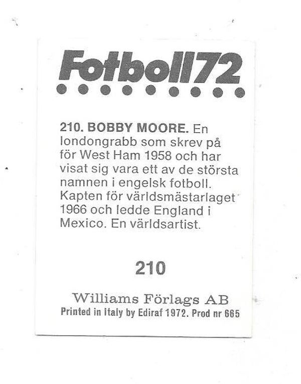 1972 Swedish Williams Football #210 Bobby Moore West Ham United , England , Fulham , Seattle Sounders , Herning Fremad , nr-nmt