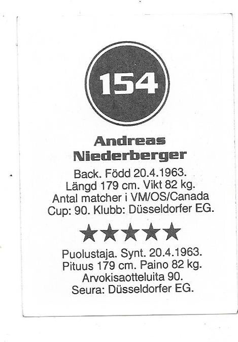 1993-94 Swedish Semic Sticker #154 Andreas Niederberger , Germany / Düsseldorfer EG , unused sticker.