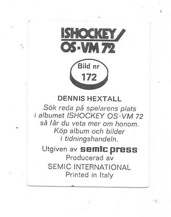 1972 Swedish Semic Ice Hockey OG & WC 72 #172 Dennis Hextall , California Golden Seals ( NHL ) , rare card in good condition , Canada.
