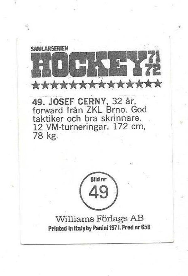 1971-72 Swedish Williams Ice Hockey #49 Josef Cerny , Czechoslovakia & TJ Brno