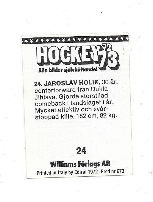 1972-73 Swedish Williams Ice Hockey #24 Jaroslav Holik , Czechoslovakia , ASD Dukla Jihlava , rare ice hockey card , condition nr-nmt.
