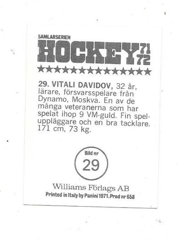 1971-72 Swedish Williams Ice Hockey #29 Vitali Davydov , CCCP & Dynamo Moscow , rare ice hockey card , nr-nmt.
