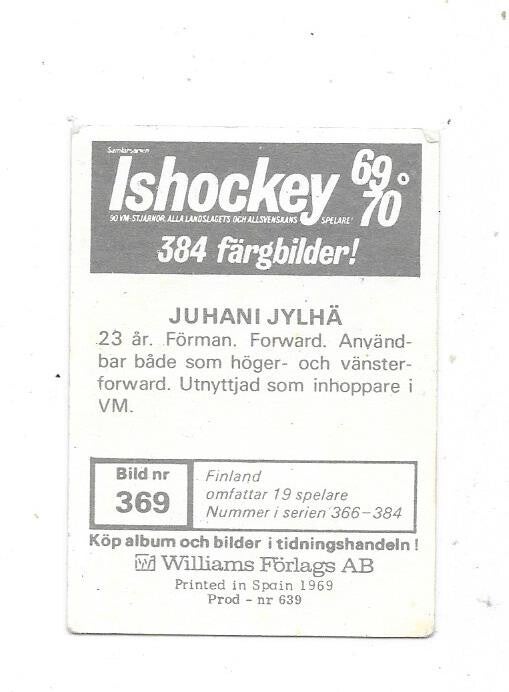 1969-70 Swedish Semic Ice Hockey #369 Juhani Jylhä , Finland / Suomi , Lukko , HIFK ,rare ice hockey card in good condition , please see the pictures.
