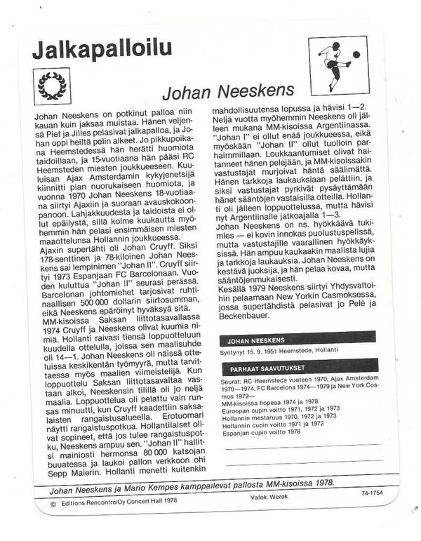 1978 Finnish Concert Hall Footbal Card # Johan Neeskens , Netherlands / Holland , rare football card from the Legend , nr-nmt.